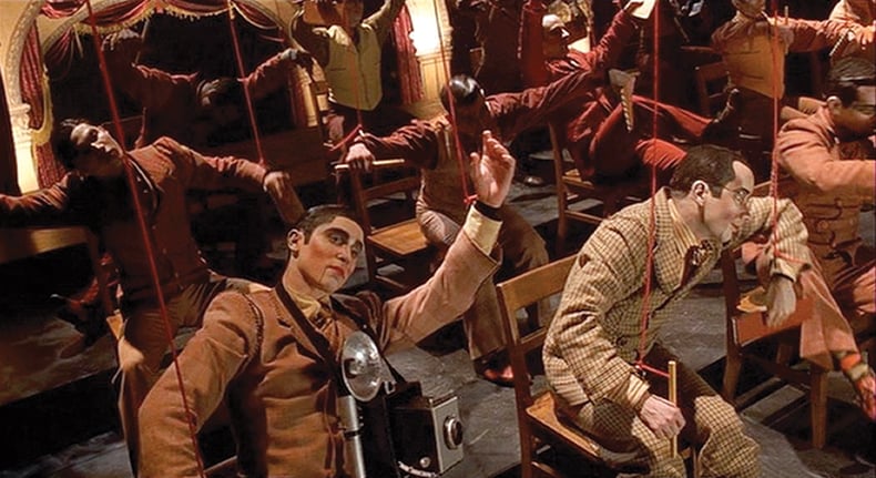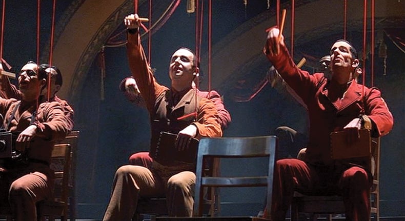 At this point the press corps comes to life as marionettes on stage. The red bungee cords serve as marionette strings and are connected to steel hooks sewn into their costumes. The big question was, "Do we expose that?" I said Yes, I want to see all the mechanics of it. So, our costume designer Colleen Atwood revealed their jacket seams so they have that puppet feel of hand-sewn costumes. I had four or five cameras working with each setup, and this shot was captured by a camera up in the theater's box, grabbing it with a long lens. John DeLuca (co-choreographer) and I worked hard to create choreography that was puppet-like: isolated moments—just one body part would move, then another—all meant to create an angular and unique dance vocabulary.