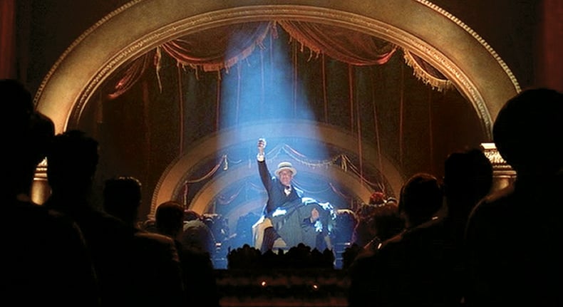 The vaudeville number comes to an end in a final tableau. You see the full stage picture here: the frozen audience in silhouette, all four proscenium arches in perspective, the reporters as lifeless marionettes, and, of course, Billy triumphant with Roxie, "the dummy," collapsed in his arms. It's a classic, formal composition. I'll never forget when we first showed this to an audience in a test preview and the place erupted into applause. I was honestly so shocked to hear that kind of reaction in a movie theater.