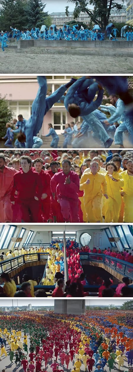 There's plenty of adrenaline, by design, in "Color Flood," which Sanders shot last summer over three days in the Czech Republic. He collaborated with stunt coordinator Gary Powell and his 1st AD Simon Warnock to synchronize all those bodies into a vibrant, acrobatic palette.