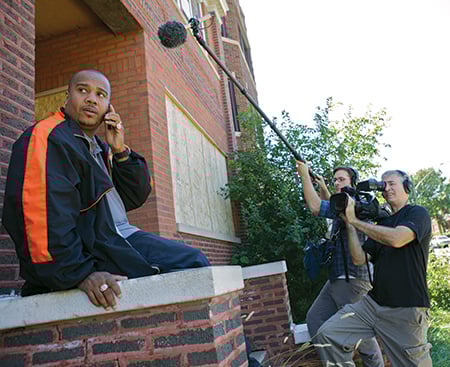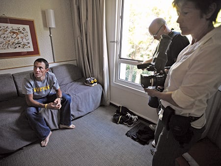 (Top) Steve James, with camera, films on location in Chicago for The Interrupters; (Bottom) From left, Lance Armstrong, director Alex Gibney and DP Maryse Alberti during the making of The Armstrong Lie. (Photos: (Top) Aaron Wickenden/Kartemquin Films; (Bottom) Photofest)
