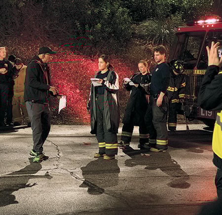 Station 19 producer/director Paris Barclay, with cap, surveys the action. (Photo: Mitch Haaseth/ABC)