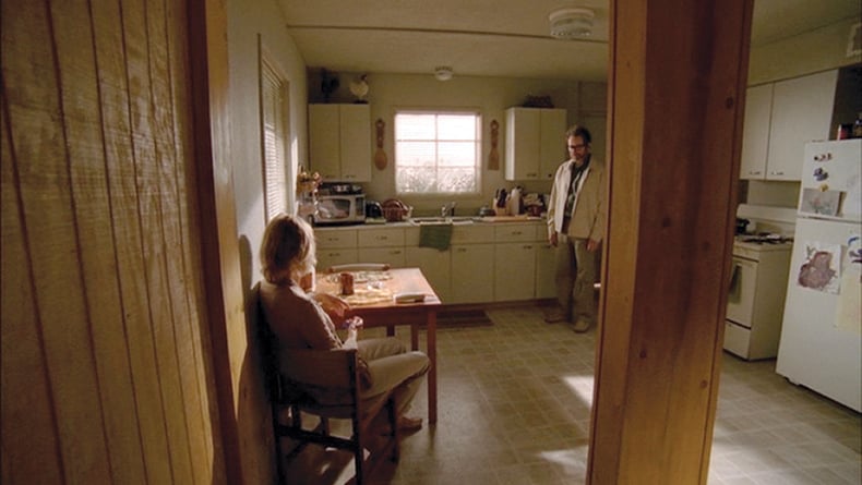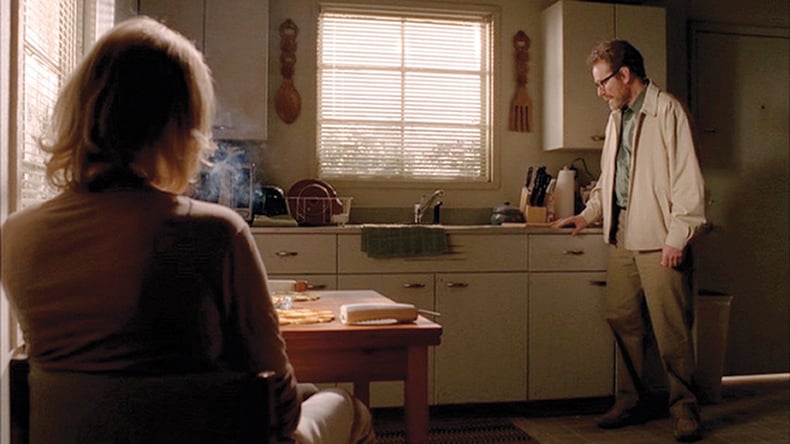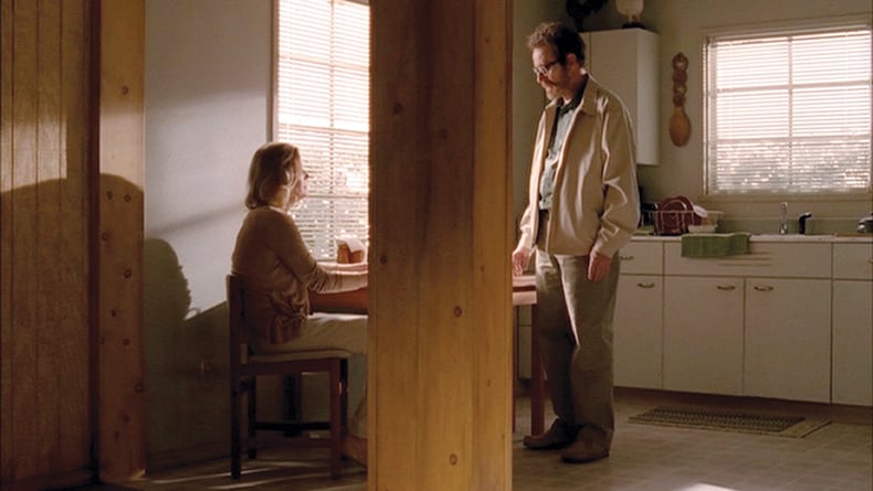 I get obsessive about matching head sizes in coverage. But here, it felt fitting that Skyler's shot was a bit wider than Walt's. Sometimes you simply go with your gut. I never want a flat, boring wall behind someone's head. I'll move heaven and earth to ensure there's as much depth as possible in every background. Here in this moment, I guess I didn't worry about it—because we're looking at Anna Gunn, whose face is the million-dollar subject of this shot, and her acting is heartbreaking.