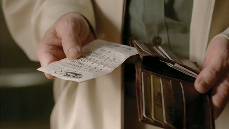 We have the best propmaster in the business, Mark Hansen. He had about a hundred of these tickets prepped in all possible variations of wrinkled and dirty, all of them dusted with the proper Albuquerque red iron oxide clay. There are two wonderful but opposing expressions: "God is in the details," and "The devil is in the details." The fact that both sayings exist is telling, because it shows you can either find greatness in the details or disaster in not paying enough attention to them. Anything you're going to focus your camera on—here it's two fingers on a lottery ticket—is the most important thing in the world at that moment. Always sweat the small stuff!