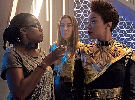 Hanelle Culpepper provides guidance to Sonequa Martin-Green, with Michelle Yeoh in the background, on the set of Star Trek: Discovery. (Photo: CBS)