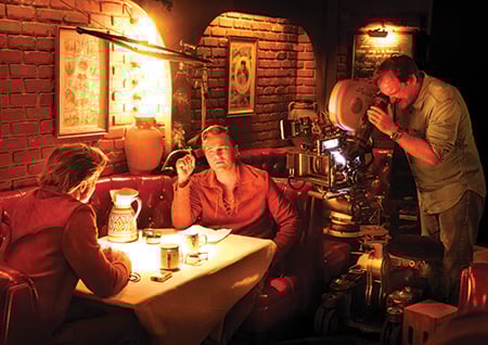 QT: So I started, and now I do it at least a couple of times per movie, but on Inglourious Basterds, it was set up to do this Josef von Sternberg shot where you take all of the art direction and put it in front of the camera. And you dolly shot through the art direction as you follow your lead character—all the candles and the glasses and the clocks and the lights and just create one big line and then put a track line in there and then have your character go like this. So that is officially a Josef von Sternberg shot.