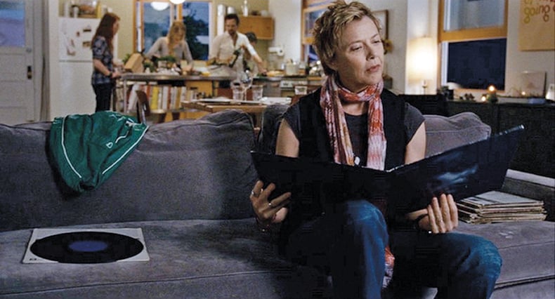 I really wanted this to feel like Paul's space—dimly lit, groovy bachelor, hipster, Echo Park pad. Nic's uncomfortable in Paul's house. The kids, Paul and Jules are making their dinner and Nic's trying to relax. She picks up this record, one of her favorites—Joni Mitchell's Blue—which becomes her moment to soften. We're back-and-forth, there's coverage of her looking at lyrics, and it gives us time to realize [that] this is a transitional moment. Now she likes this guy. I kept them soft in the background but when the camera does go back there, we see Jules looking at Nic, and that is what's important: that the two of them are actually weirdly alone in this scene. Nic is the odd man out, awkward, not part of the clan yet.