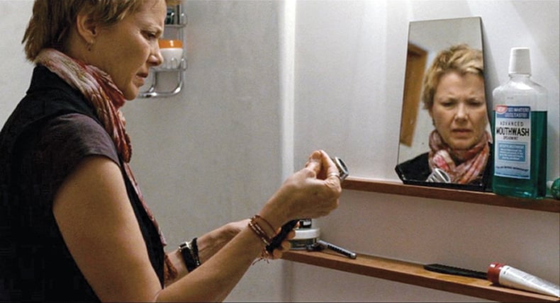 Nic walks in like all is well but then sees a brush on the shelf with red hair like Jules' on it. She looks in the tub and sees that there's red hair in the drain, as well. Now she knows something is not good. We had it handheld because we had to get a lot done and wanted it to be freer and less formal, as if now things are becoming unglued. I think the audience is kind of expecting the discovery without knowing how it's going to happen or when. Maybe they'll have this nice dinner and then it will be revealed at home. We did our best not to reveal, as we called it, the 'red hairing' of the red hair in the bathroom. And I think we buried that pretty well.