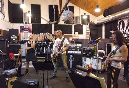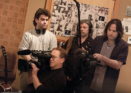 Joe Berlinger (top left, with headphones) and Bruce Sinofsky (top right) documented group therapy sessions with members of Metallica for the 2004 documentary Metallica: Some Kind of Monster. (Photos: Photofest)