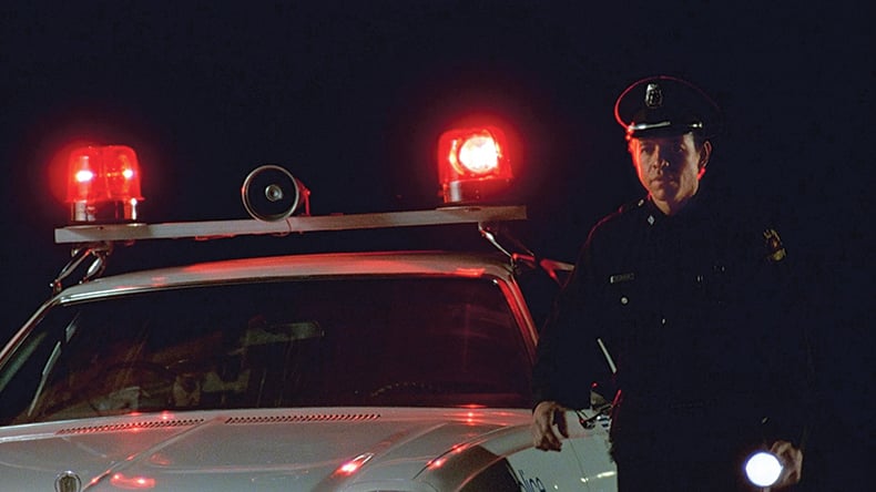 We shot this on City Island in New York and in a garage in Brooklyn. Officer Wood approaches the car with his ominous shadow preceding him. A low angle shot lit by the bright headlights of the police car. I used a music cue from Philip Glass, from "Facades." It worked so extraordinarily well that I kept saying, "We better get someone to write like Philip Glass." And then I thought, why not Philip Glass himself? It took months to get him to look at a rough cut of the film but once he did, he said immediately that he would write the music. He still says that it's the score that he is most proud of.