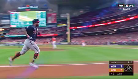 With the tying run on first base, Astros manager A.J. Hinch replaced Greinke with Will Harris, an iffy move that backfired on the first pitch—a cutter low and away to Howie Kendrick that was slammed off the foul pole in right field, and the Nationals never looked back. "We have a great audio crew," says Gangl. "On that Kendrick home run, you hear that 'dong' as it hit the side of the foul pole. We've got a mic there."