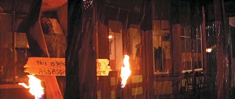 The scene is seen through the reaction of the journalist (Saul Rubinek). He's been chronicling this Wild West stuff. But all of a sudden, he's in the middle of it and he's not sure he likes it. We shot on Technicolor lenses; this is probably a 100mm, four-inch lens that could go in close like this and be less apt to distort. Most of the time, I shoot single camera, to give the shot my full attention. You're trying to make it look as real as possible, so it doesn't distract from the emotions of the scene.