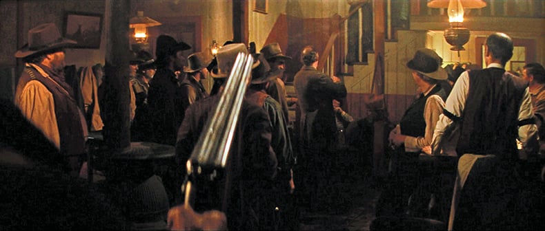 Munny's telling the guy in the right foreground to get out of there. By keeping the guy in frame, you keep them tied together. Then, when I turn around to get his reaction shot, the audience understands the geography as it's happening and nothing shocks them inadvertently to throw them out of the scene. The kerosene lamp behind Munny keeps it backlit with cross lighting from his left side. The scene is generally backlit by the light that's hanging there, so it all seems to look normal when of course, there are studio lights to supplement.