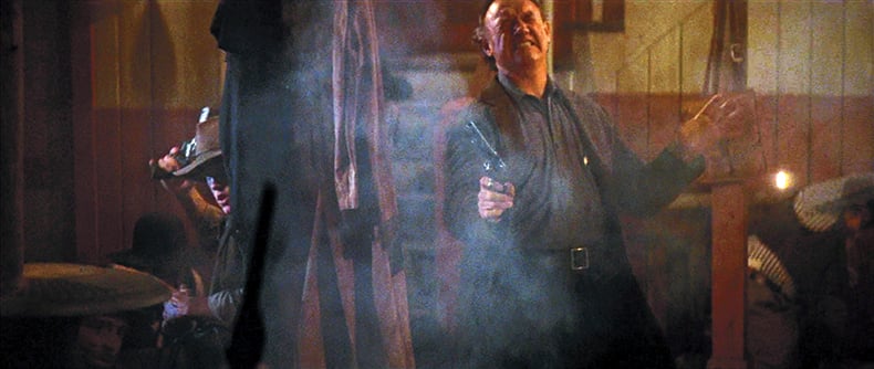Munny is standing over Bill—we have him sort of cross, backlit. They have an exchange; Munny brings the shotgun up and the rest is history. I expected a lot from Gene and he gave it to me. Making a movie is a lot of little pieces. You have to get a visual of it and keep it with you all the time, then make sure everything you're doing fits in with it. And then, one day you're done and thinking, "What the hell was this all about?" You've looked at it so many times, you're sick of it. And then you show it to somebody and they say, "Hey! This is OK!"