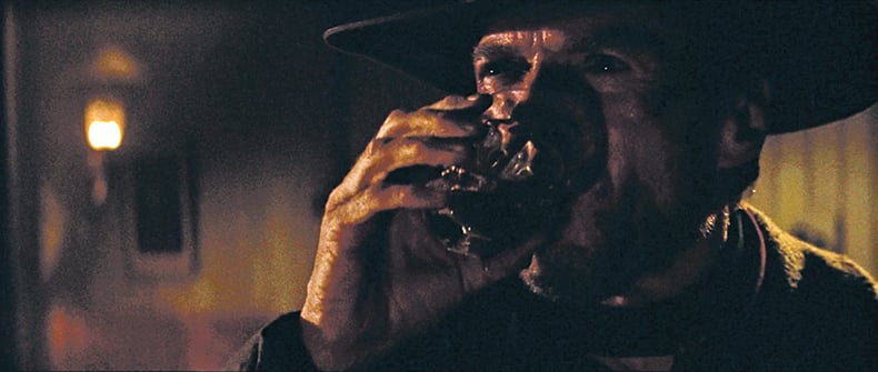 Munny steps up and pours himself a shot. This is the moment he's gone back to being the old renegade killer that he was. I love shadow. If you photograph somebody's face offset, maybe see one eye and part of another, you get something that's more dynamic. What I like in a film is what your imagination is seeing, as opposed to your eyes. If they don't quite see, the audience wonders, "What's going to happen now? Is he going to be shot in the back?" Jack Green and I were brought up with Bruce Surtees, who would light stuff with a penlight just to get a little effect—Bruce and I were always very much in sync and Jack had the same instincts.