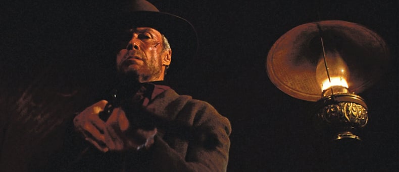 When Munny turns around and sees Little Bill on the floor, you know he's going to kill him, and the audience is probably rooting for it by now. Munny has the kerosene lamp on his face and we'd have a movie light higher, augmenting, but that would be it. Making those decisions, you can always ask, "What's the most realistic thing?" Well, there were lights in the middle of the room, and everybody can be photographed accordingly. But the main thing is, what are you going to succumb to? That technical aspect? Or the fact that you want this picture to look really good, and the scene to be dramatic?