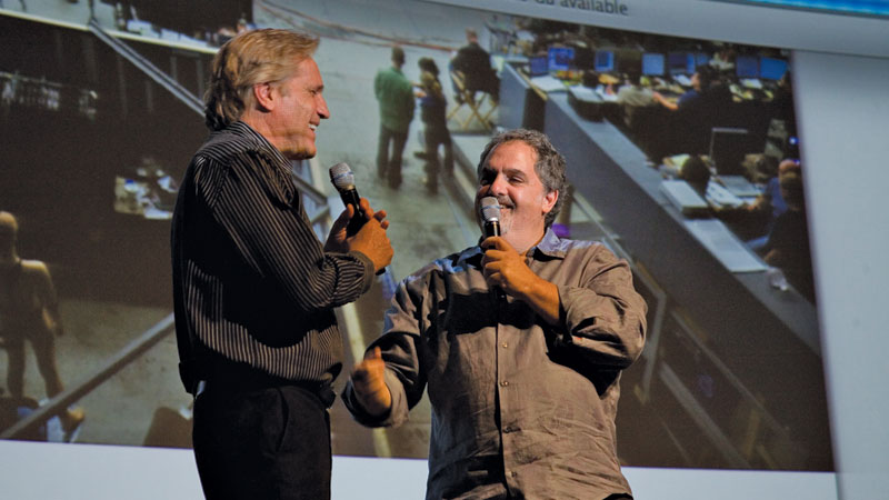 Supervising Virtual Art Director Yuri Bartoli explained how his department helped bring to life Cameron’s surrealistic alien world Pandora. GAIA Designer Tim Bicio revealed how they successfully managed the unprecedented volume of nearly one petabyte of computer-generated images and digital captures of actors’ performances. Motion Capture Supervisor Matt Madden explained the process that blended the actors’ performances with the computer enhancements that turned them into the 10-foot tall and blue Pandoran aliens. Virtual Production Supervisor Glenn Derry gave a practical demonstration of the virtual camera and helmet technology that allowed for the first real-time virtual reality filmmaking system. Richard Baneham, who won both an Academy Award® and a BAFTA Award for Best Visual Effects for his work as Avatar’s Animation Supervisor, explained how he worked with the actors to produce a CG performance that evoked the full emotional range of their live performances. He was joined onstage by Production CG Supervisor Nolan Murtha, who broke ground on the film as the first ever real-time scene operator.