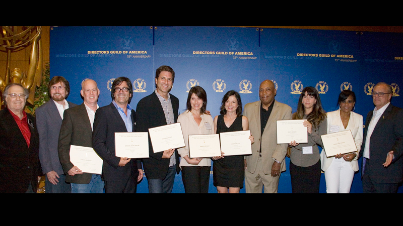 left to right: ATAS Board of Governors members Lee Miller and John Moffitt; Outstanding Directing for a Variety, Music or Comedy Series nominee Gregg Gelfand (American Idol, “Episode 1024/1025A”); Outstanding Directing for a Comedy Series nominees Michael Alan Spiller (Modern Family, “Halloween”), Steve Levitan (Modern Family, “See You Next Fall”), Pamela Fryman (How I Met Your Mother, “Subway Wars”), and Gail Mancuso (Modern Family, “Slow Down Your Neighbors”); DGA First Vice President Paris Barclay; Outstanding Directing for a Drama Series nominee Patty Jenkins (The Killing, “Pilot”); Outstanding Directing for a Variety, Music or Comedy Special nominee Laurieann Gibson (Lady GaGa Presents The Monster Ball Tour: At Madison Square Garden); and ATAS Chairman & CEO John Shaffner.