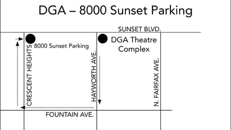 During construction, the DGA will not have the use of the surface parking area currently used as overflow parking for DGA screenings, meetings and special events. While construction is taking place, it may be necessary to direct members and their guests to other off-site parking areas. The DGA has made arrangements for off-site parking at 8000 Sunset Blvd (the Virgin Megastore Complex). This area is located one (1) block West of the DGA on Sunset Blvd. and should provide more than ample overflow parking during the construction phase of the project. If you are directed to park your vehicle at 8000 Sunset Blvd., you must obtain a validation to secure complimentary parking. These validations are available at the security console located in the lobby of the Guild Building. Please bring your 8000 Sunset Blvd. parking ticket with you and it will be validated.