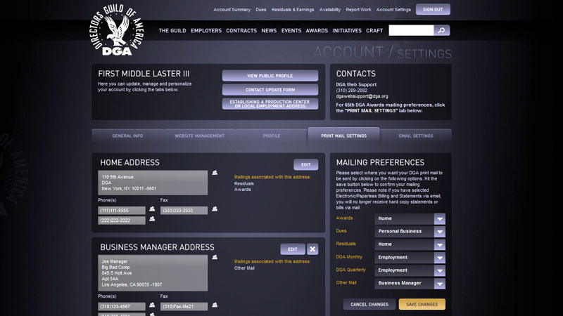 - Once your address information is up-to-date, review your MAILING PREFERENCES to determine where you want your DGA print mail to be sent. Use the dropdown menus to make any changes for each mailing preference and click SAVE CHANGES to confirm.