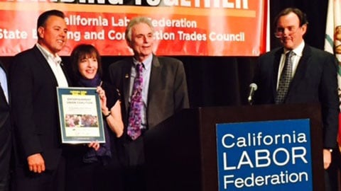 DGA’s Associate Executive Director of Government and International Affairs, Kathy Garmezy, together with Ed Duffy (Teamsters Local 399), and Carlos Cota (IATSE Local 122) accepted the “Legislative Action Award” on behalf of the Entertainment Union Coalition from Art Pulaski, Chief Officer, California Federation of Labor, AFL CIO.